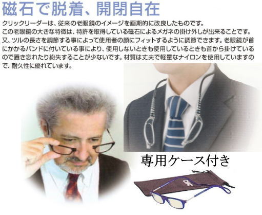 センターのマグネットによって掛け外しができる画期的な老眼鏡(シニアグラス・リーディンググラス)です。